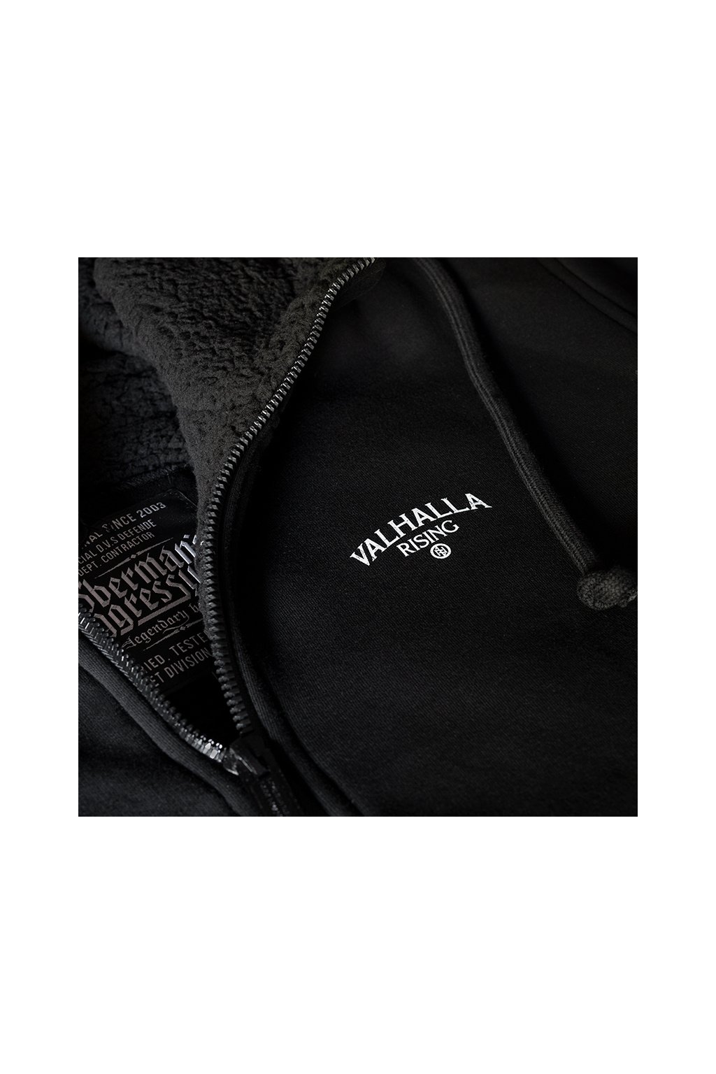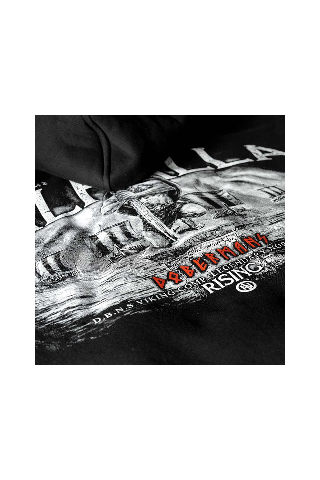 The raised collar merges into a spacious, insulated hood. The garment is made of high-quality cotton. On the left side of the chest of the sweatshirt is the inscription "Valhalla Rising". The back is largely covered with a print depicting a half-kneeling Viking leaning on a sword. In the background, a fleet of ships at sea can be seen. The graphics draw on Scandinavian motifs.