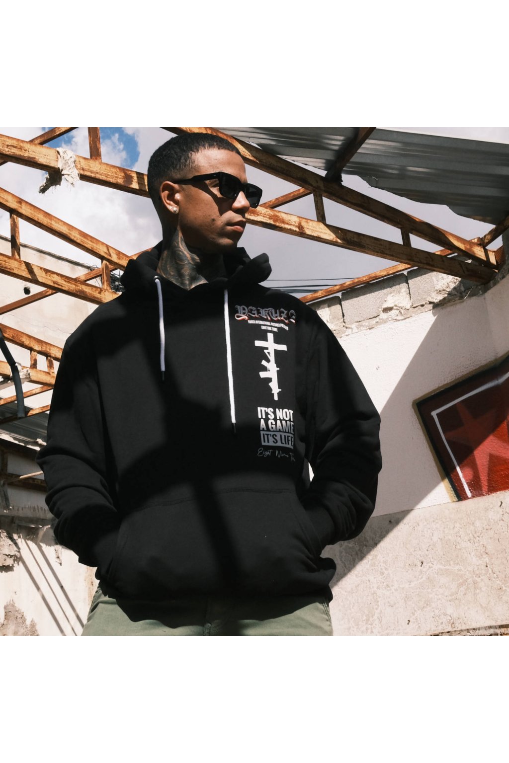 YAKUZA NEVER STOP Men's Hoodie. This high-quality hoodie from the classic range is a comfort essential for this season. Not too slim, not too loose, just right. It features slip pockets, a drawstring hood and ribbed hems. In addition, this hoodie also displays a vintage print and Yakuza logo tab on the side seam and a rubber tab above the hem. Please pay attention to our size specifications and washing instructions below.