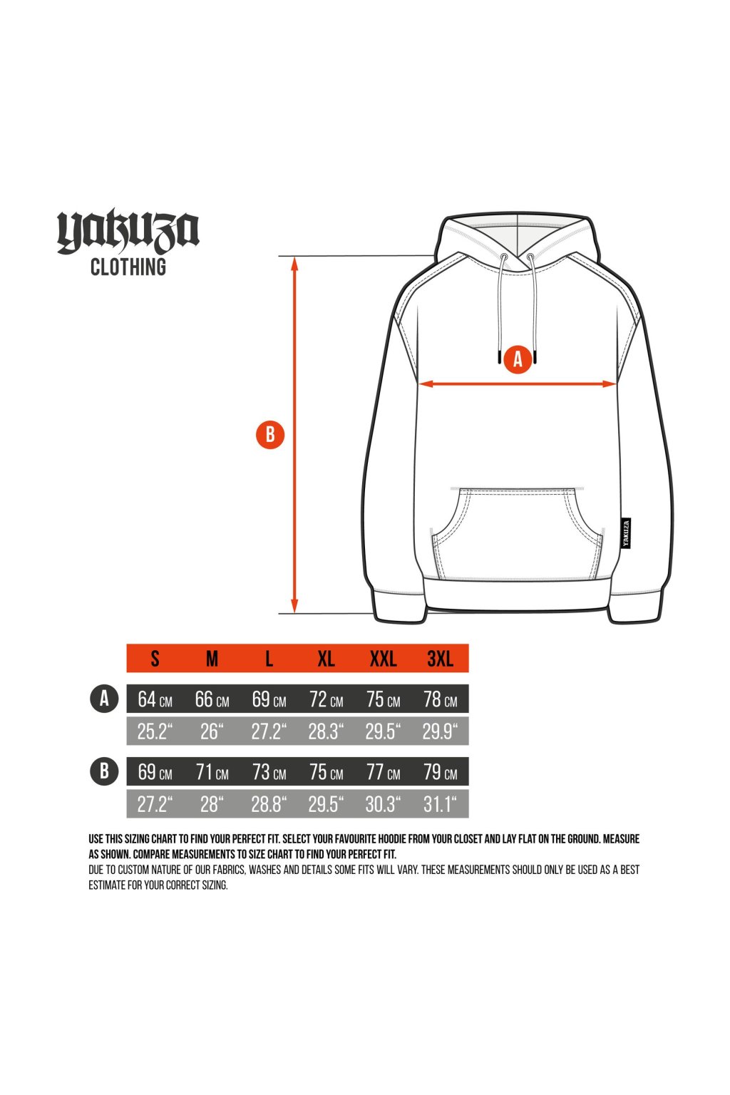 YAKUZA REIGNZ Men's Oversized Hoodie. This high quality and super soft oversized hoodie is a must-have for this season. It features a hood, front pocket and ribbed trim. It is also treated with special dyeing techniques to give it a unique look. The hoodie also features an amazing splatter print and iconic logo appliqué, as well as the Yakuza logo on the side seam and elastic above the hem. Please refer to the size specifications and washing instructions below.