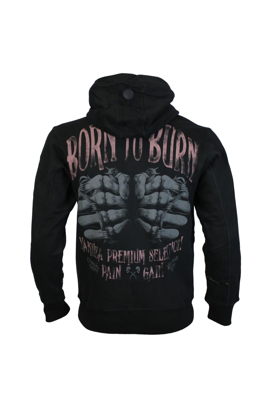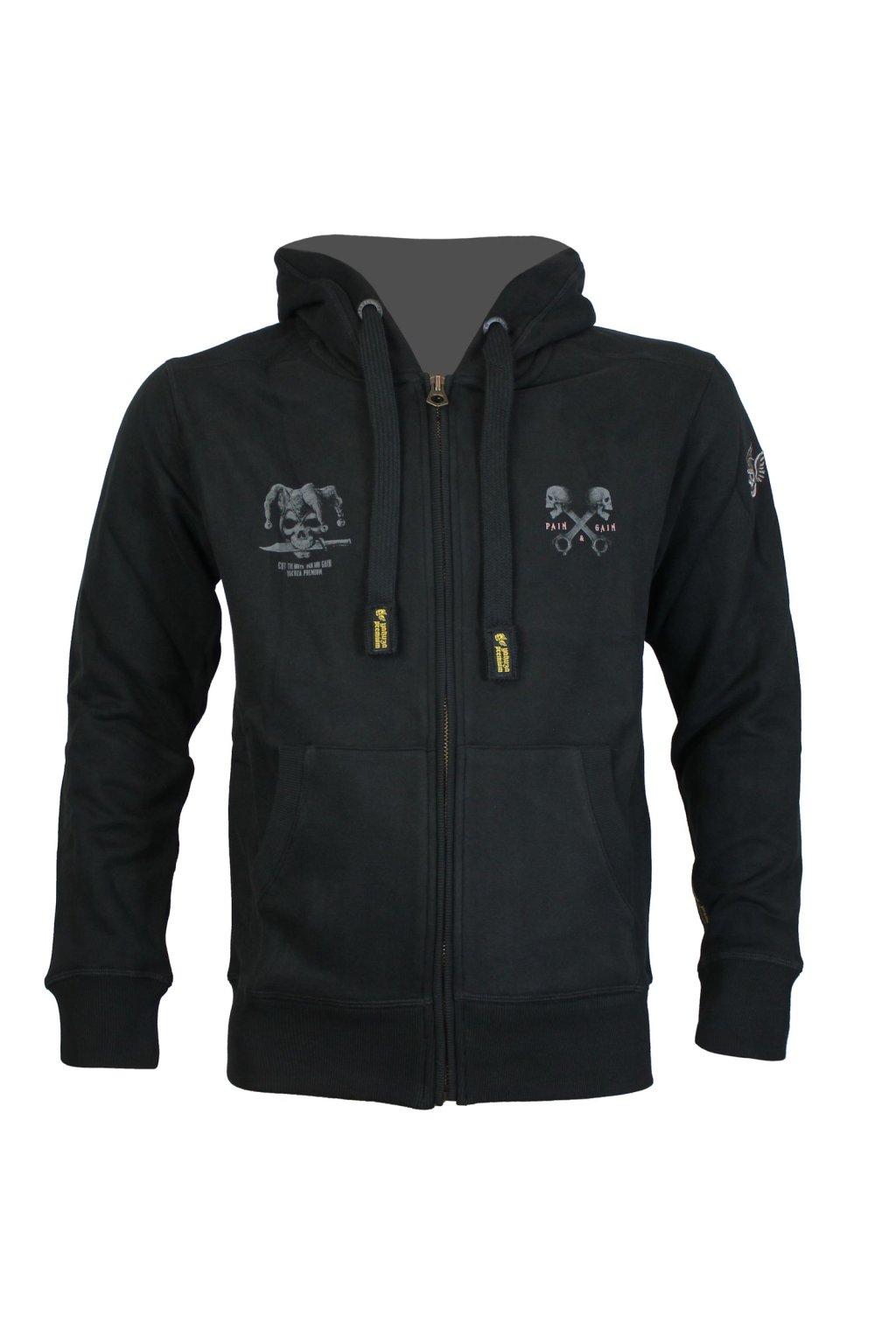 Special sweatshirt YPHZ 3925 C in black from Yakuza Premium Selection. This is a limited edition zip sweatshirt from the 39 collection. The jacket has a hood, zip and front pockets. There is a large multi-coloured print with two fists on the back and two prints at chest height on the front. A really great transitional jacket made of comfortable fabric thanks to the combination of soft cotton. The dimensions for size XL are 50 cm, 58 cm, 68 cm and 60 cm, measured horizontally. Material: 80% cotton and 20% polyester. All items in all colours and sizes can be found in your Yakuza premium store.