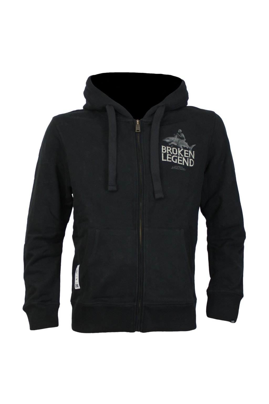Special 211 sweatshirt from Broken Legend. This is a limited edition zip sweatshirt from the first official Broken Legend spring/summer 2026 collection. The jacket has a hood, zip fastening and front pockets. There is a large shark print on the back, while a smaller print is located on the left chest. The embroidered lettering gives the jacket a special touch. A really great transitional jacket made from a comfortable and soft cotton blend. Broken Legend in collaboration with Yakuza Premium.