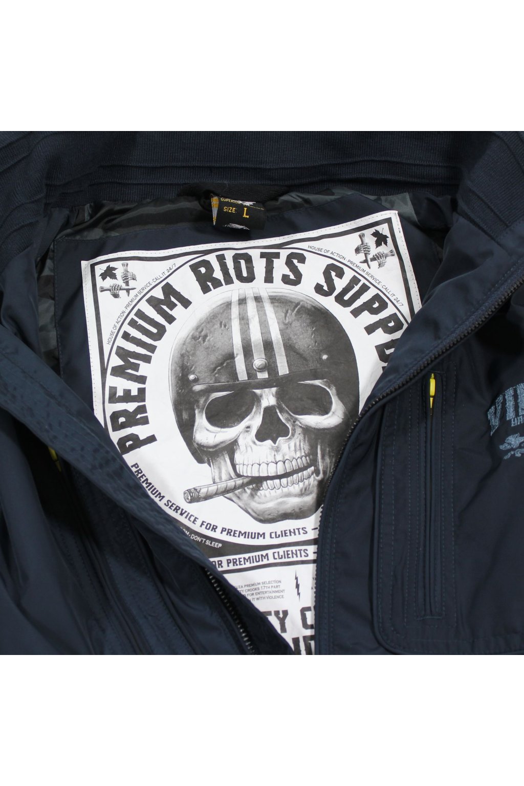 Limited edition 3860 summer jacket in dark blue from Yakuza Premium for men. This jacket will not only keep you warm, but also looks incredibly stylish. It has a thin, tucked-in hood, an embroidered logo on the left chest and four front pockets. There is a large tone-on-tone print on the back. The jacket has a loose fit and is true to size. Ribbed cuffs help keep you warm. Quantities are limited, so based on past experience it will only be available for a short time. See the pictures for more details.
