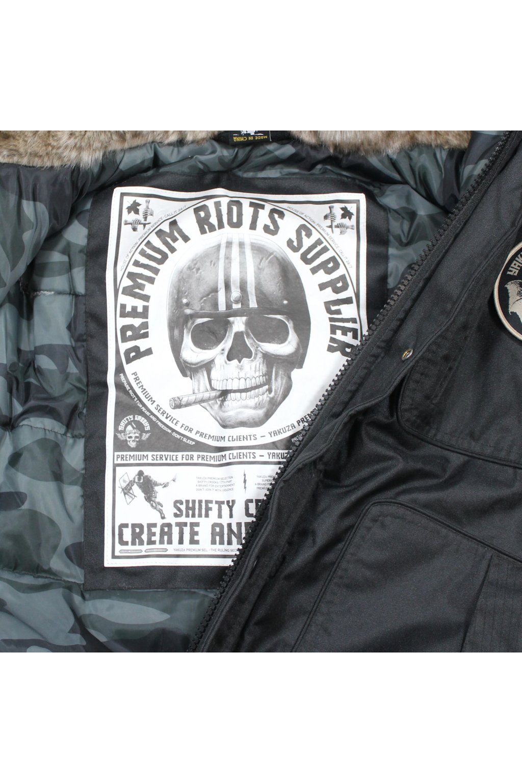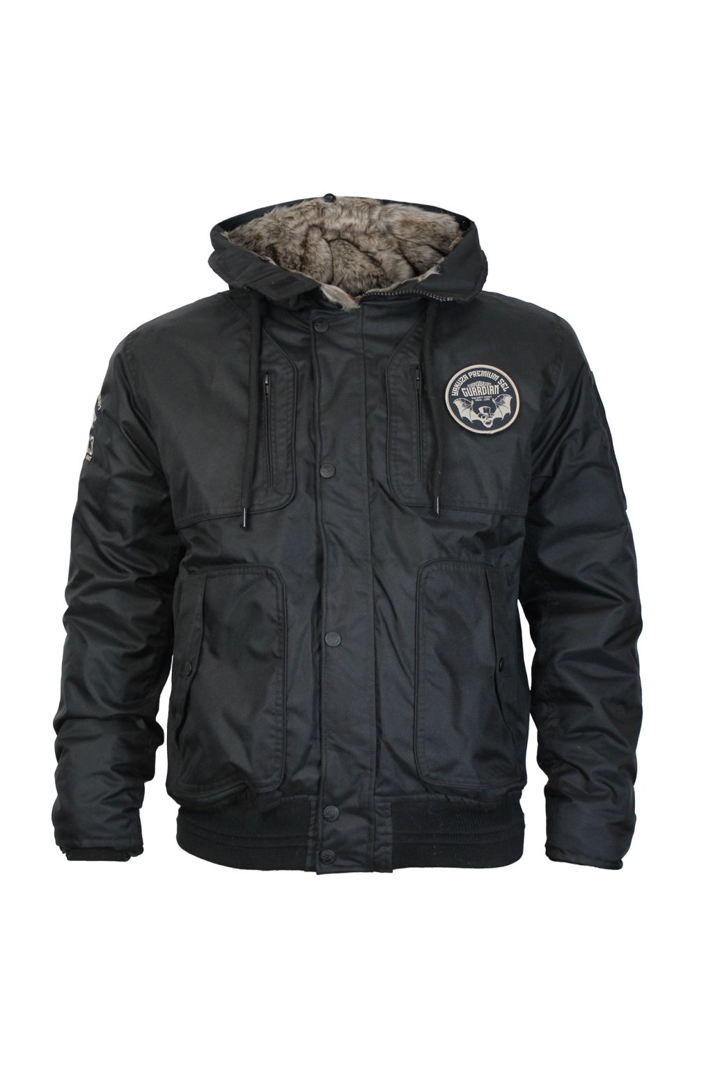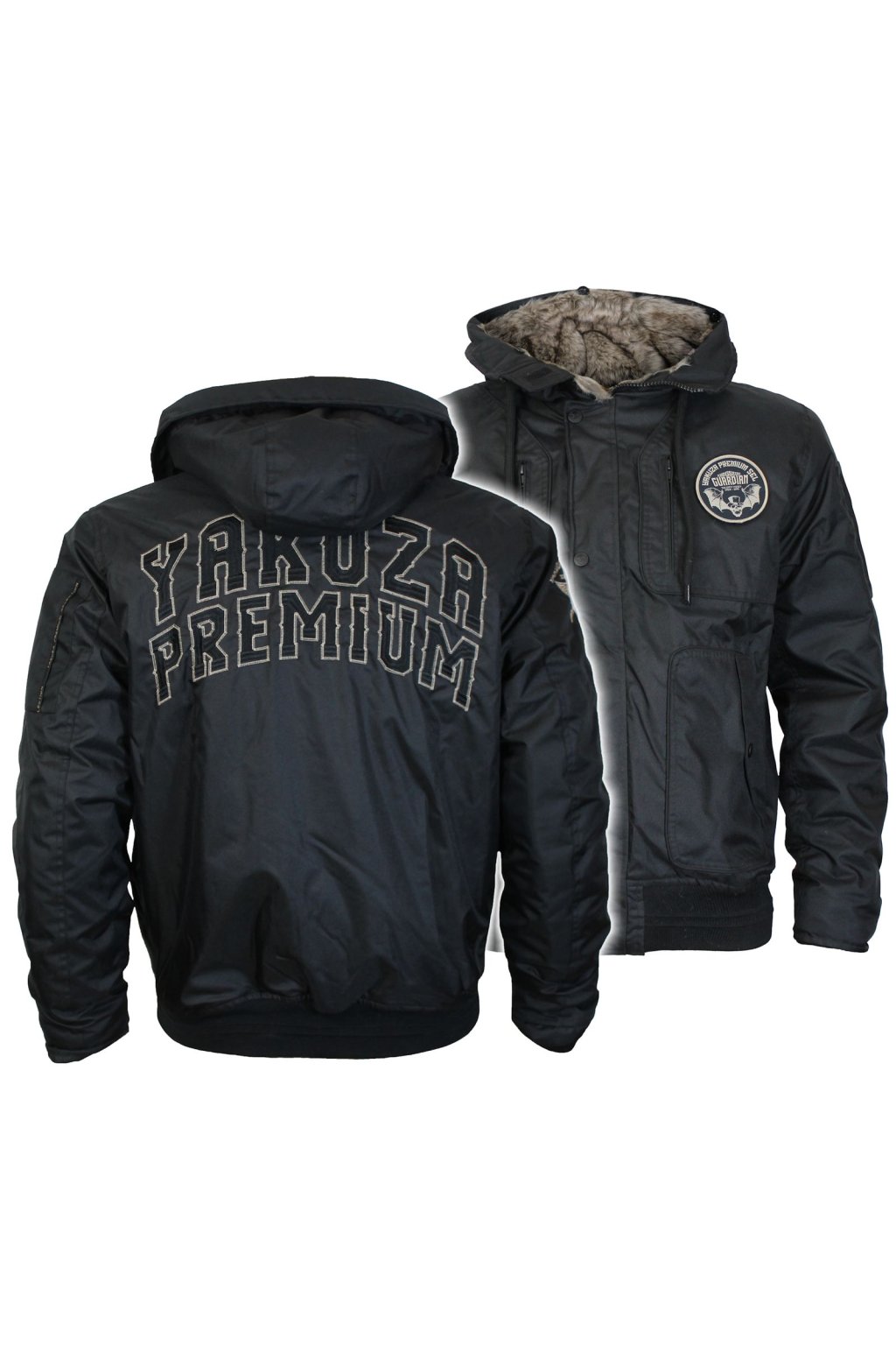 Limited edition winter jacket 3765 in black from Yakuza Premium for men. This jacket not only keeps you warm, but also looks incredibly stylish. It has a hood with a removable fur collar . There is a removable velcro on the left side of the chest. There is a large embroidered Yakuza Premium logo on the back of the jacket. This winter jacket stands out with numerous details. It has a discreet pocket on the left sleeve, four front pockets and one inner pocket. The embroidery is also on the right sleeve. The jacket has a fairly loose fit and is true to size. The cuffs also keep the heat in place.