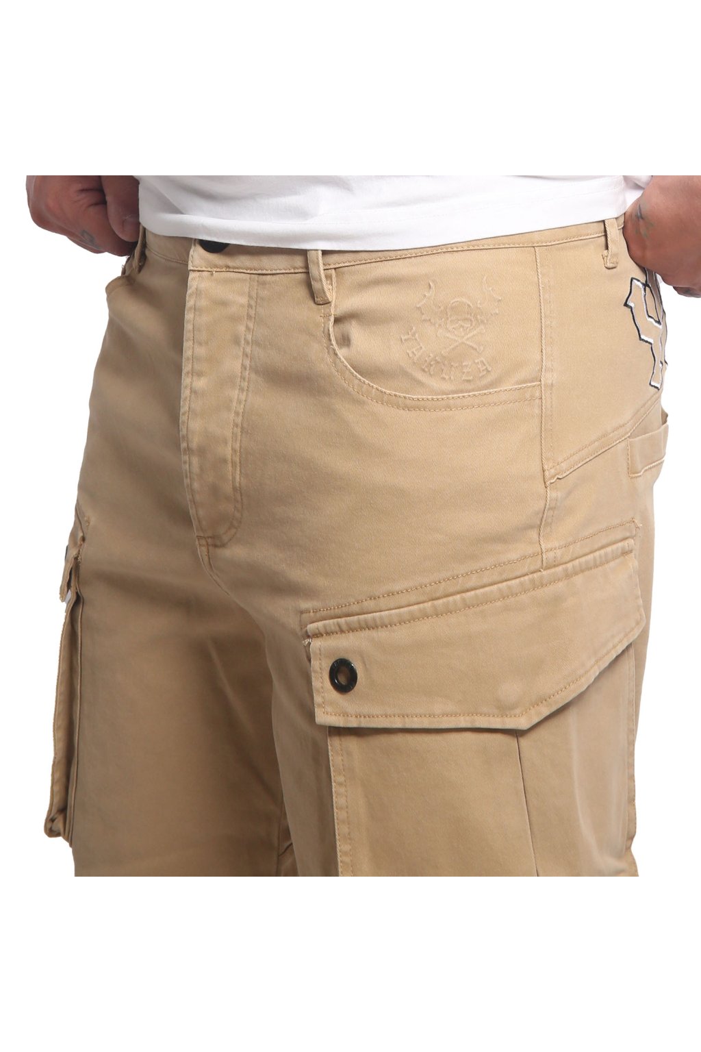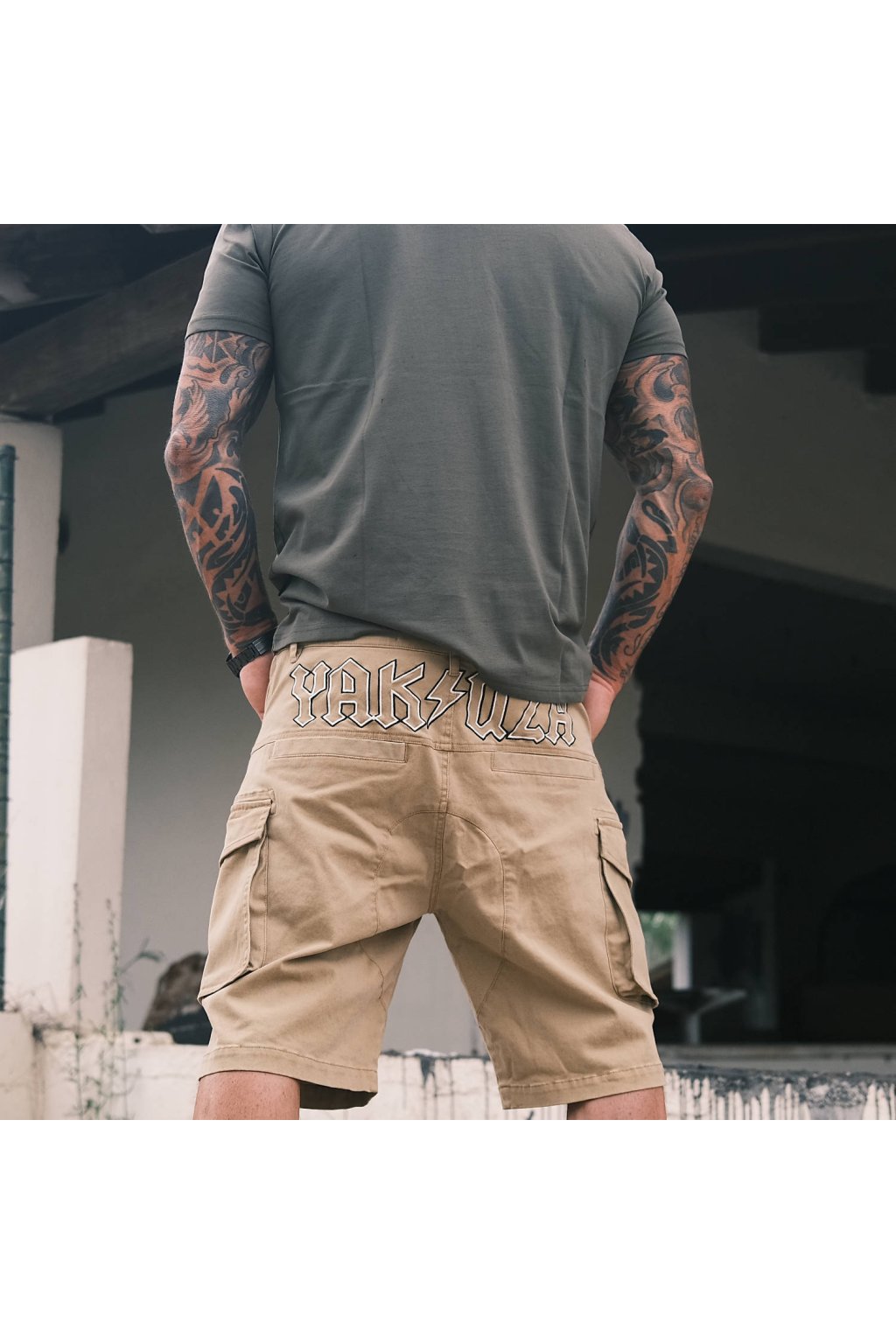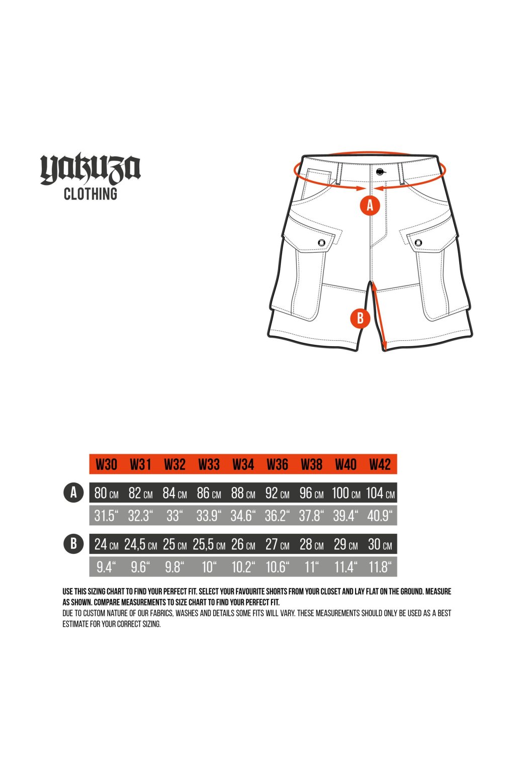YAKUZA Men's Cargo Shorts. Stay comfortable in these relaxed classic cargo shorts: Not too tight, not too loose, just right. These shorts add a rugged vibe to your style, featuring a seven-pocket design, button fastening and belt loops. The shorts are finished with epic logo appliqués, an embossed Yakuza logo on the front pocket and a logo label above the back pocket. Please pay attention to our size specifications and washing instructions below.