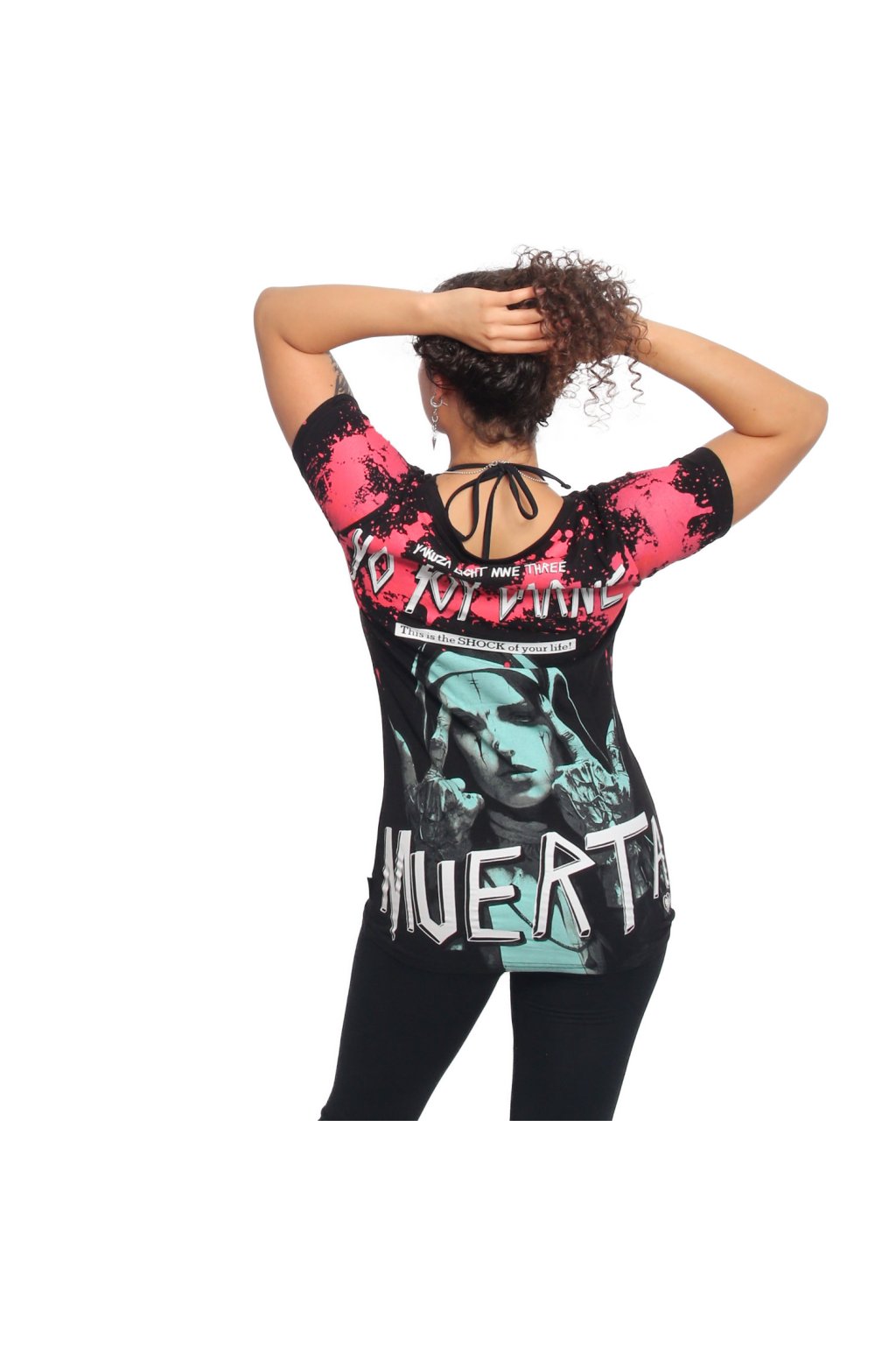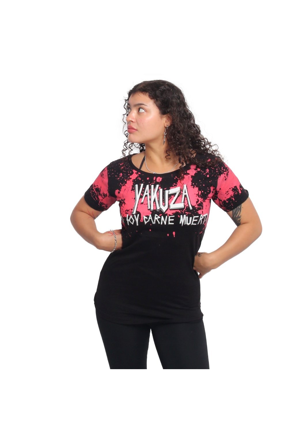 YAKUZA CARNE women's t-shirt. Perfect for a relaxed style: Not too slim, not too loose, just right. This t-shirt features a ribbed neckline, a curved hem and a vintage print. It is completed with a logo on the side seam. Please pay attention to our size specifications and washing instructions below.