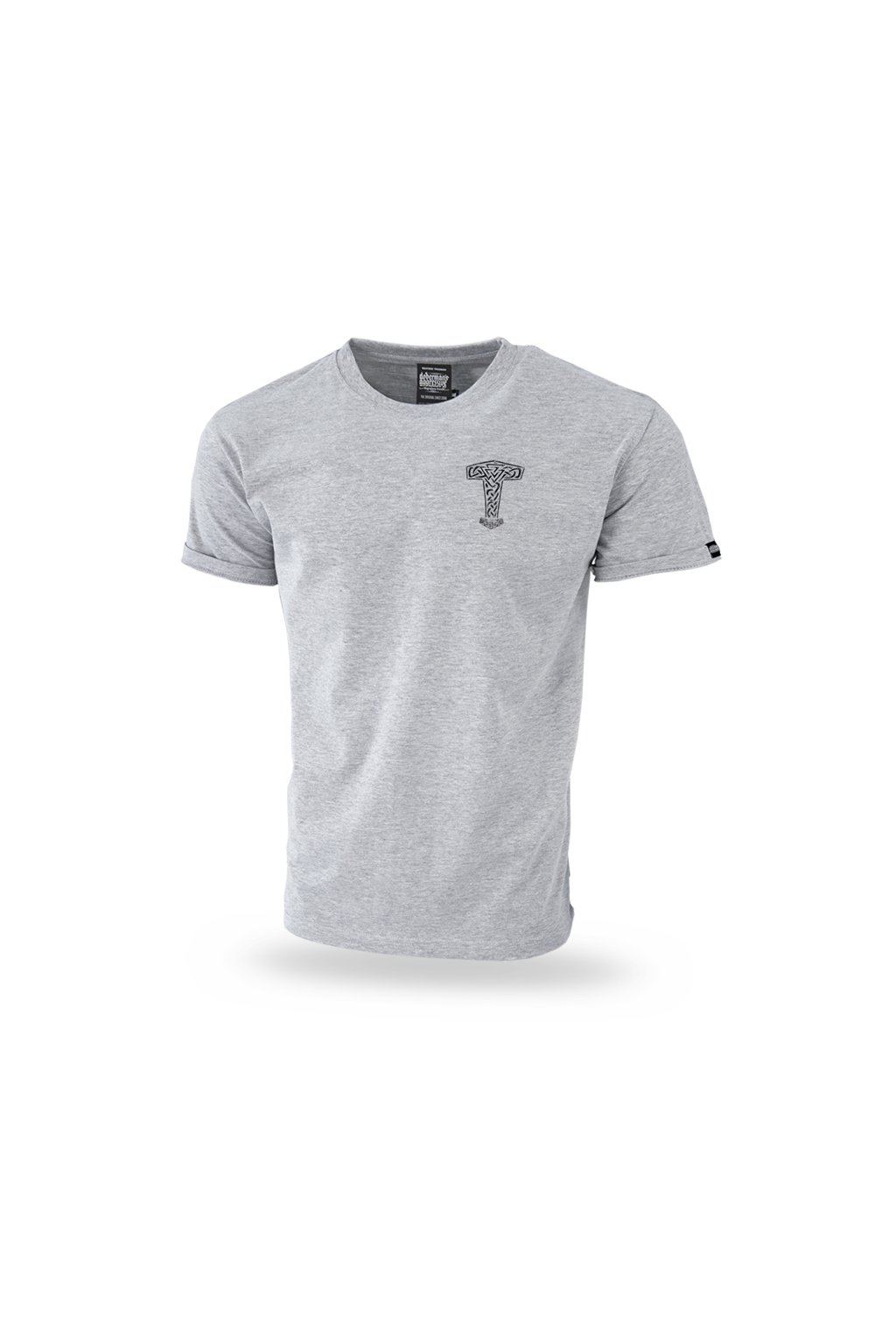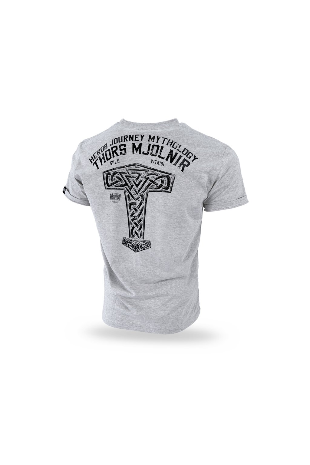 Men's classic-cut T-shirt. Made of high-quality cotton. A small label with the brand logo is sewn on the left sleeve. On the back there is a pattern depicting Thor's hammer with the inscription HEROS JOURNEY MYTHOLOGY THORS MJOLNIR and the Doberman's Aggressive logo. On the left side of the chest there is a miniature Thor's hammer pattern.
