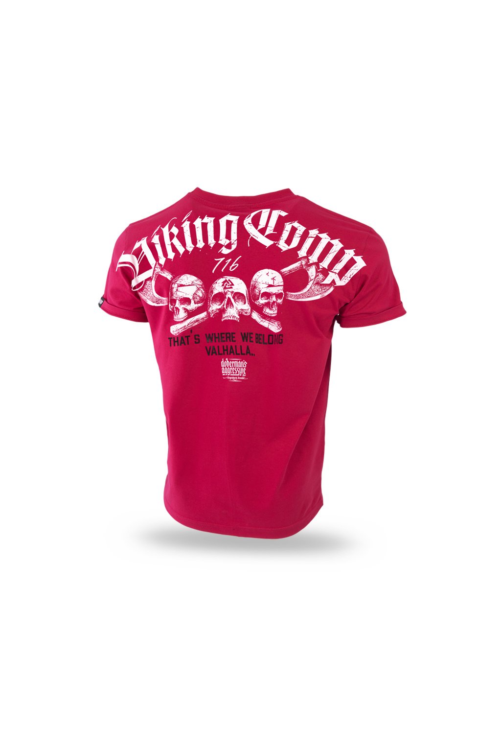 Men's classic cut T-shirt. Made of very heavy weight cotton. There is a small label with the brand logo sewn on the left sleeve. On the back there is a two-tone pattern with the inscription Viking Comp, three skulls and axes and the inscription "That's where we belong Valhalla". On the front on the left side of the chest there is a miniature of the pattern that is located on the back of the T-shirt.