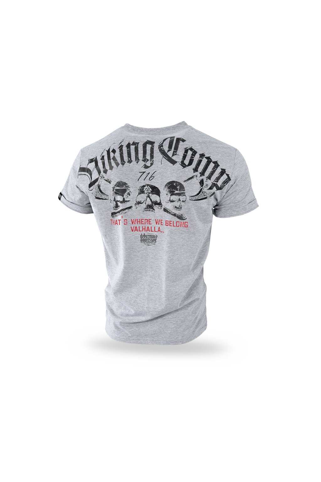 Men's classic cut T-shirt. Made of very heavy weight cotton. There is a small label with the brand logo sewn on the left sleeve. On the back there is a two-tone pattern with the inscription Viking Comp, three skulls and axes and the inscription "That's where we belong Valhalla". On the front on the left side of the chest there is a miniature of the pattern that is located on the back of the T-shirt.