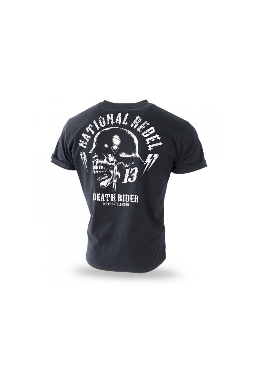 The T-shirt is made of 100% high quality cotton. On the back, a solid color pattern with a large surface, a pattern with a skull with a helmet, the number 13 and the inscriptions: National Rebel and Death Rider. Added four lightning bolts on the sides. On the left side of the chest, a repetition of the print with the skull motif on a smaller scale.
