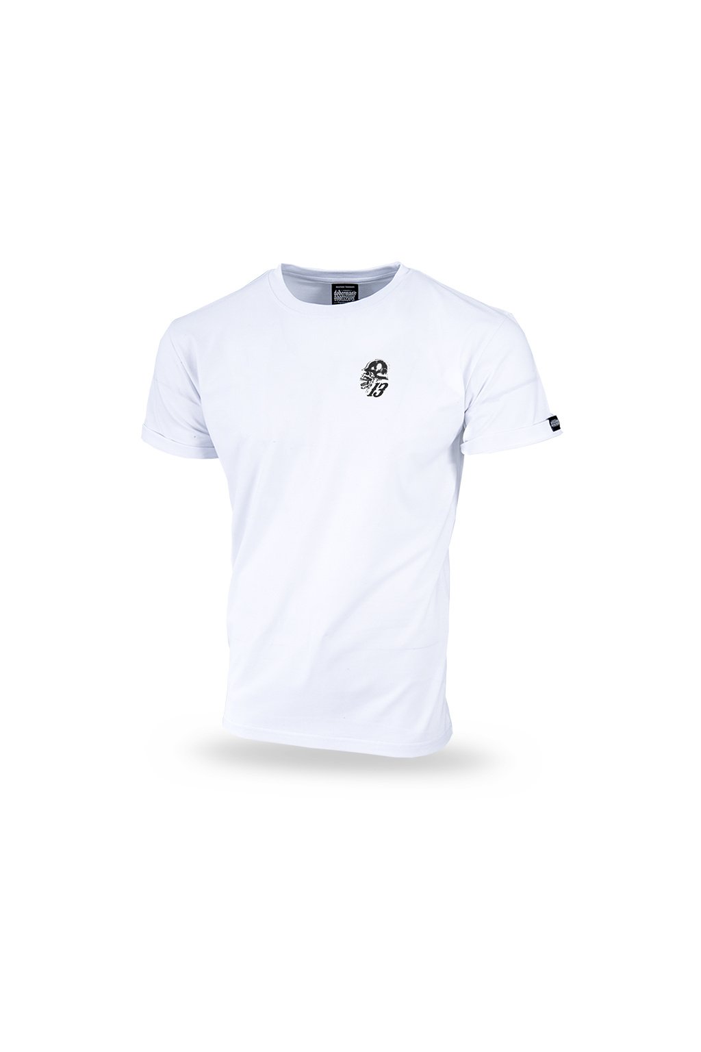 The T-shirt is made of 100% high quality cotton. On the back there is a solid color pattern with a large surface, a pattern with a skull with a helmet, the number 13 and the inscriptions: National Rebel and Death Rider. Four lightning bolts are added on the sides. On the left side of the chest there is a repetition of the skull motif in a smaller scale.