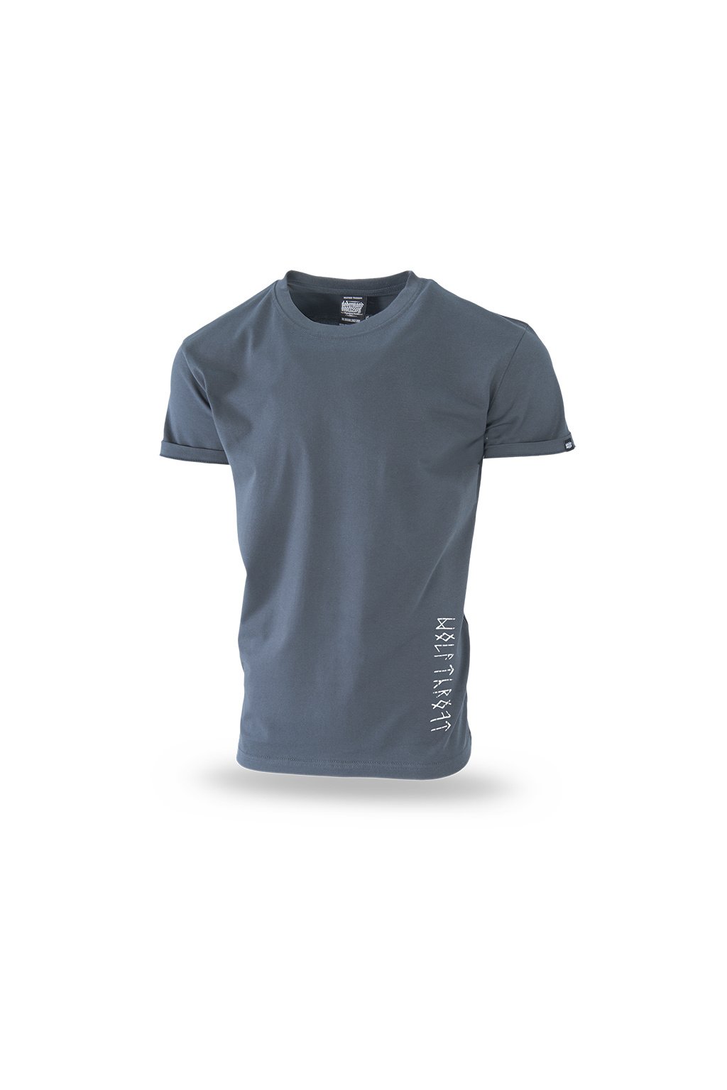 High-quality T-shirt with a two-tone print inspired by Scandinavian culture. The back of the T-shirt is decorated with a pattern that takes up almost the entire surface of the product and represents a Viking helmet and axe. Above is a large inscription Bloodaxe, and below is the slogan "I grew Up A Warriors Fan", which is repeated on the front in a smaller scale. Added date 793 and the suffix Viking Comp. Used Gothic font and crackle effect of the print. Short-sleeved T-shirt in a standard men's cut, finished at the neck with a drawstring and internal pleating. There is a black label with the brand logo on the sleeve.