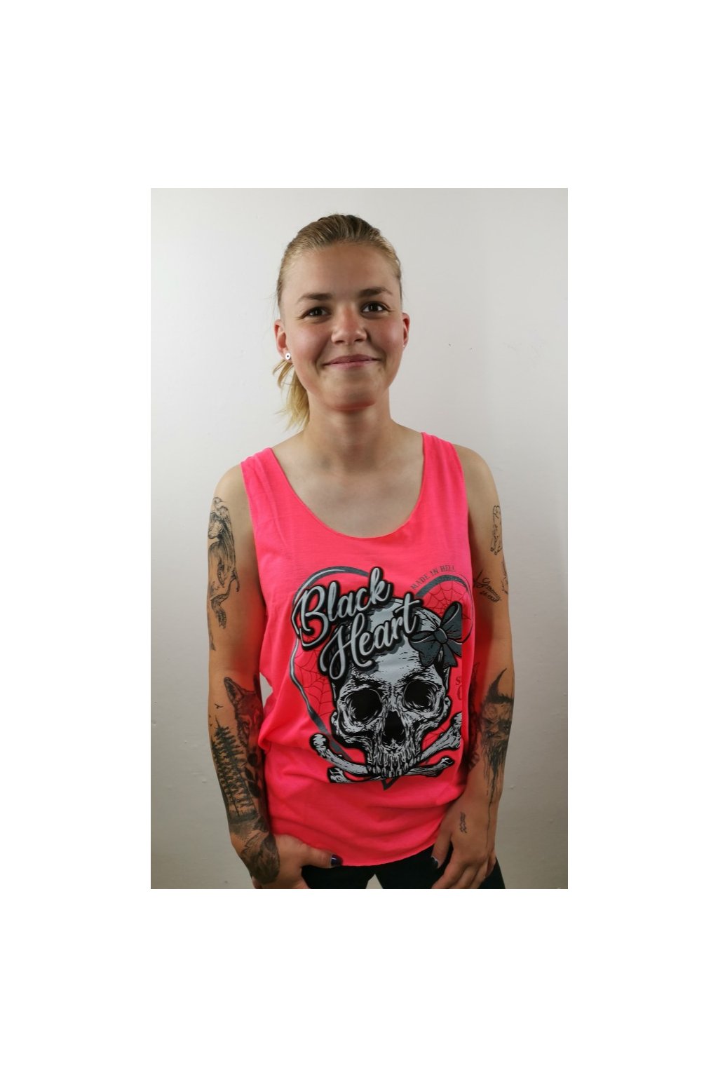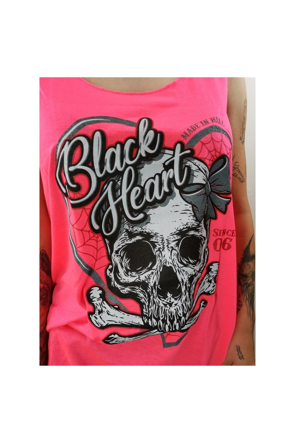 Women's sleeveless T-shirt BLACK HEART RIBON SKULL NEON