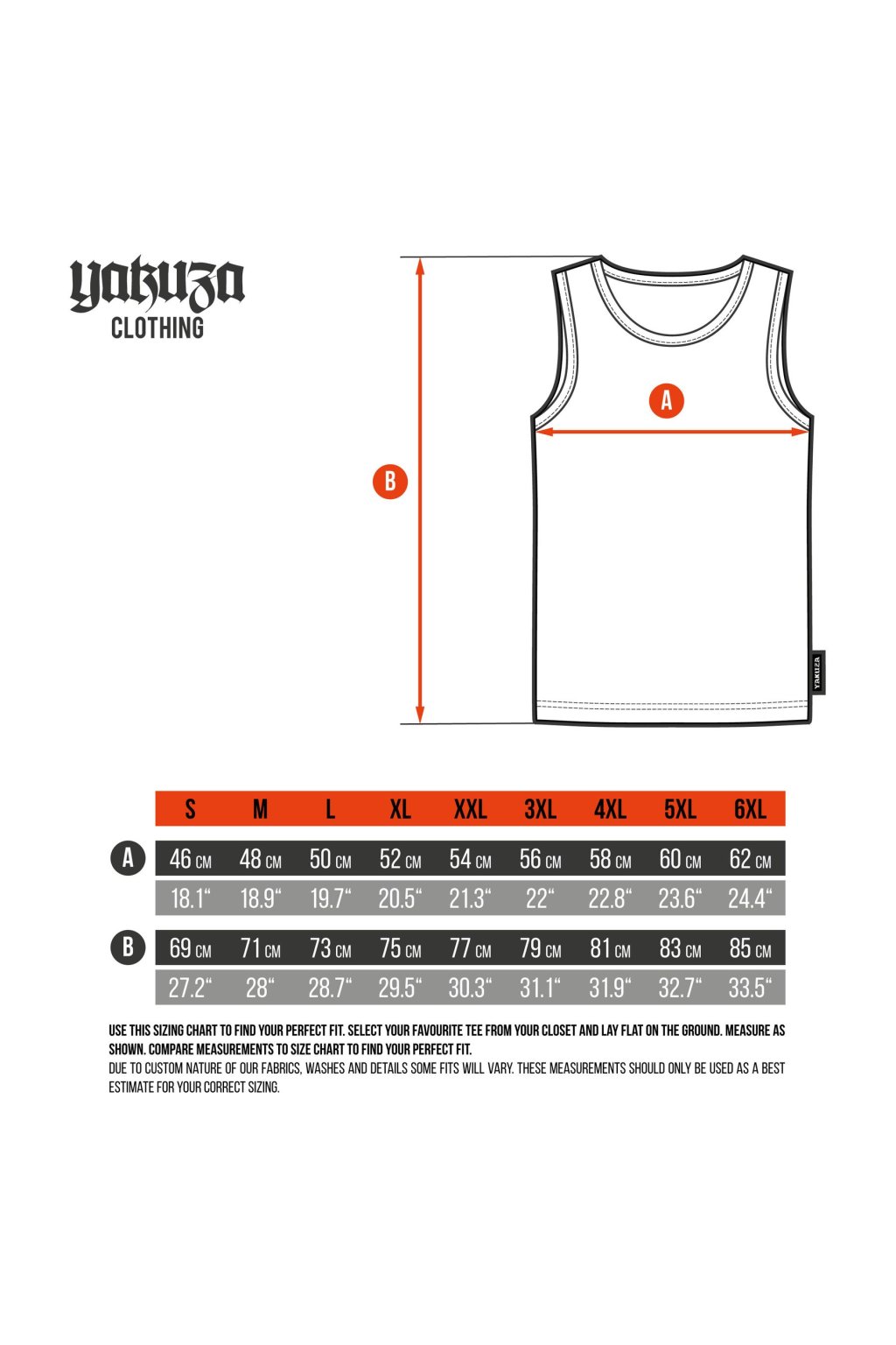 YAKUZA Men's Tank Top. The iconic slim fit tank top - designed to fit closer to the body for a better look. This sleeveless top with a crew neck has ribbed hems and is finished with a vintage print and a Yakuza logo tab on the side seam. Please pay attention to our size specifications and washing instructions below.