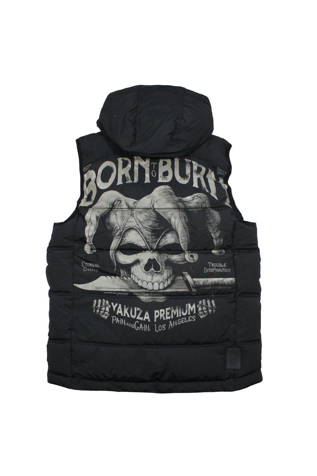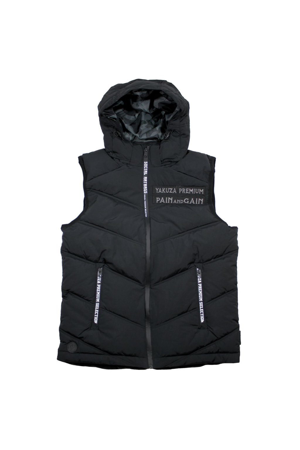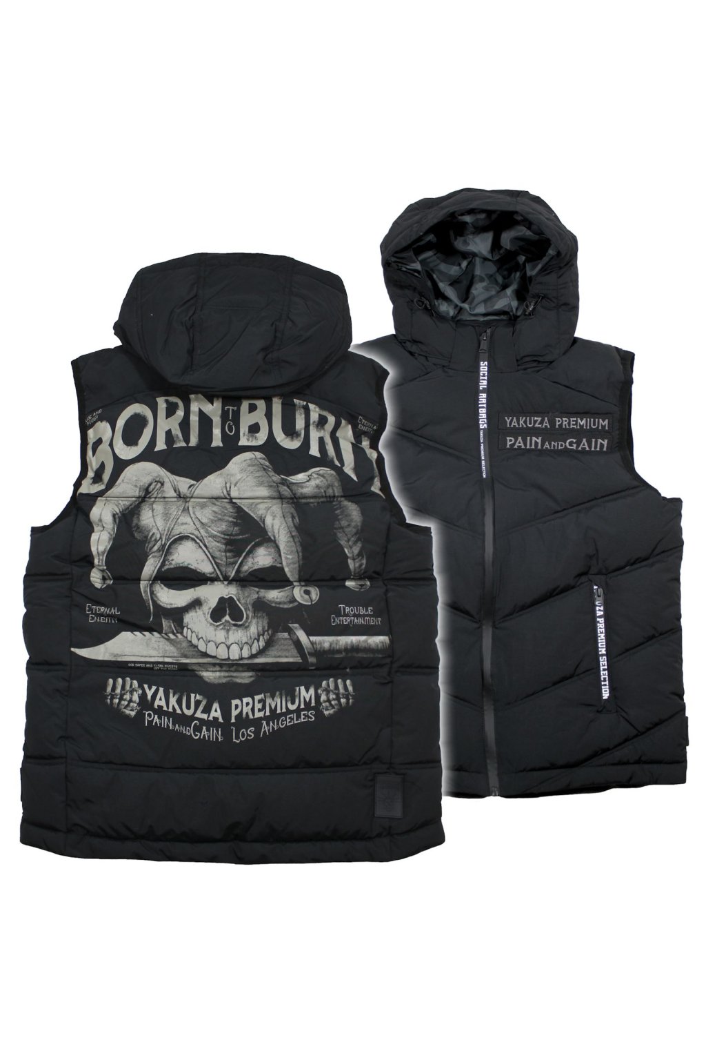 Limited edition 3966 vest in yellow from Yakuza Premium for men. This quilted vest will not only keep you warm, but also looks incredibly stylish. It has a removable hood, a double patch on the left chest and two front pockets. There is a large harlequin print on the back. The printed zippers make this quilted vest unique. The vest has a fairly loose fit and is true to size.