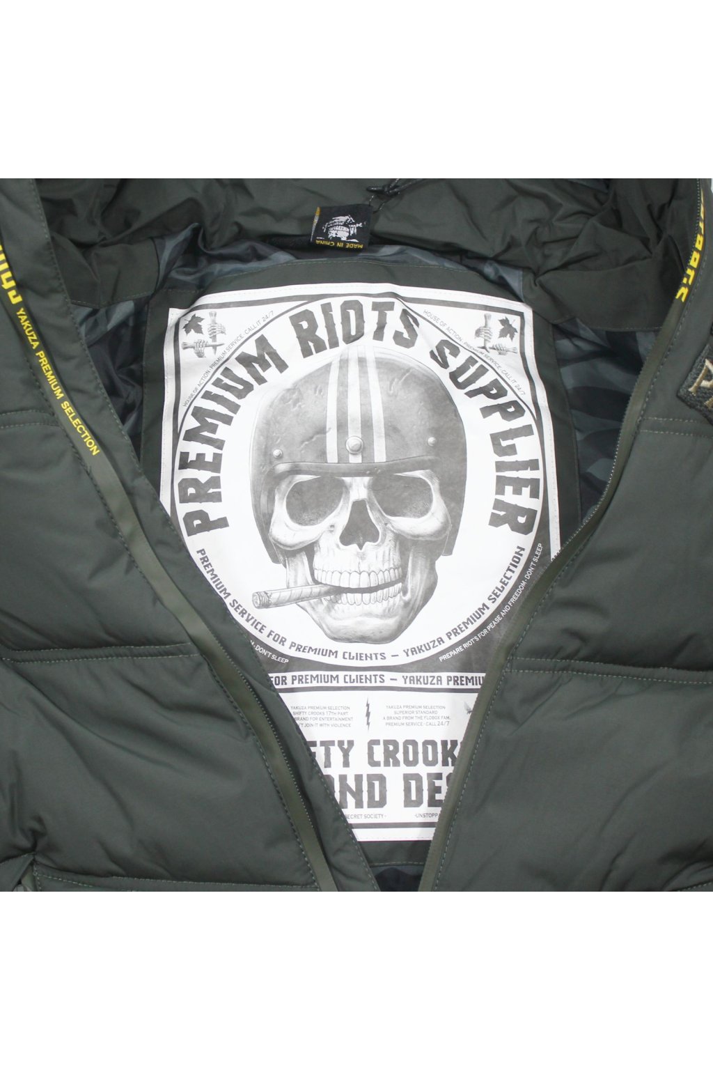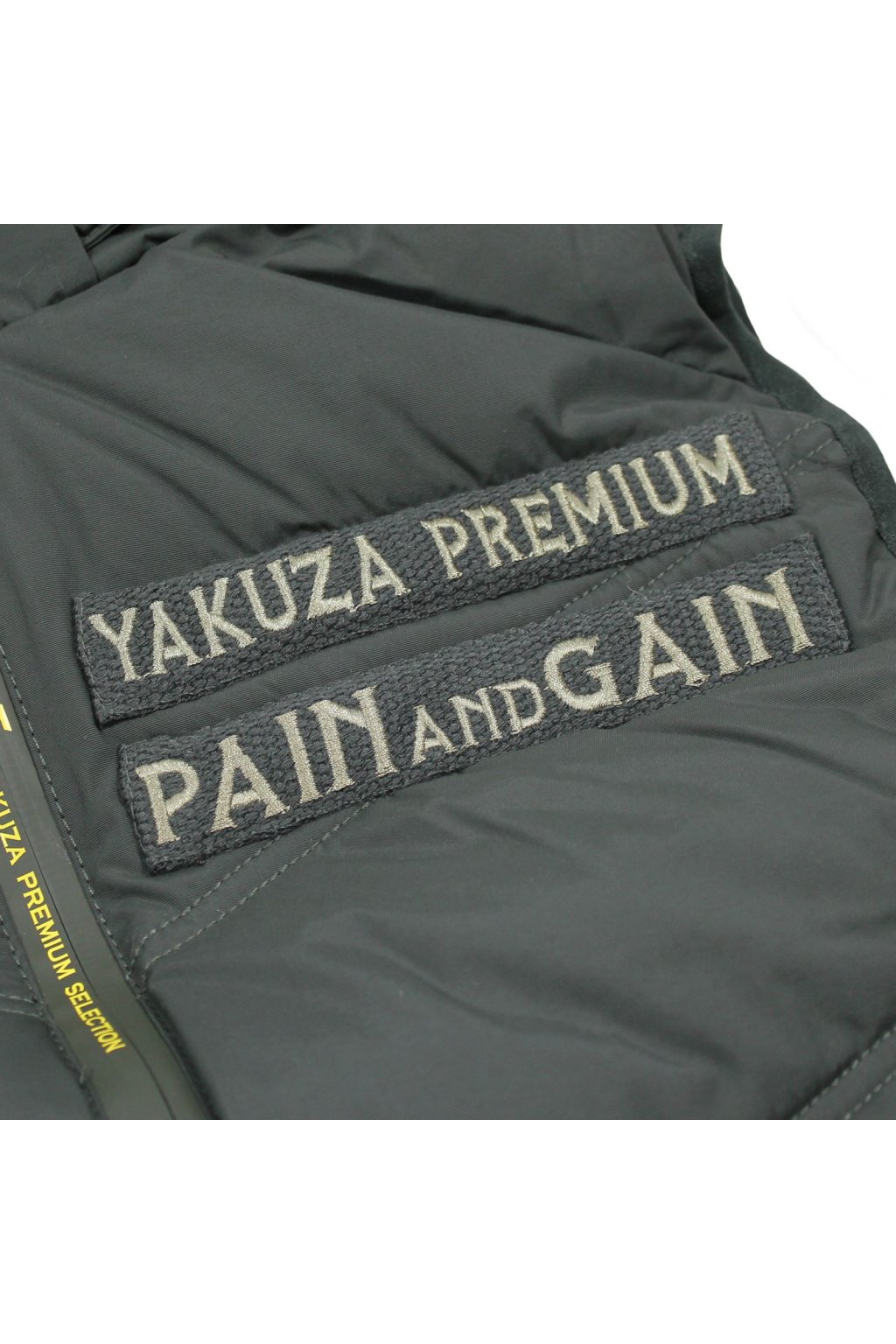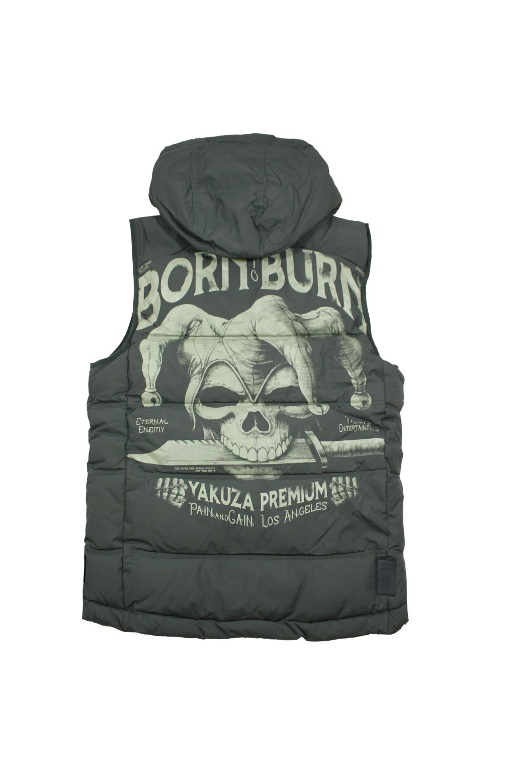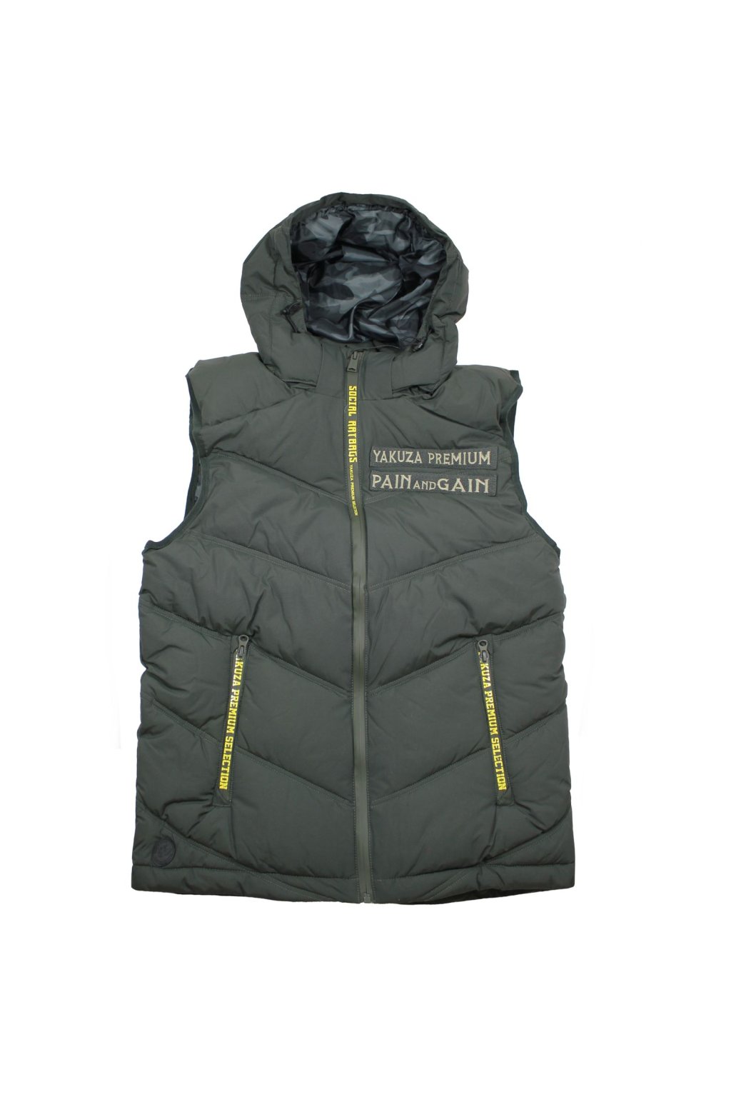 Limited edition 3966 vest in yellow from Yakuza Premium for men. This quilted vest will not only keep you warm, but also looks incredibly stylish. It has a removable hood, a double patch on the left chest and two front pockets. There is a large harlequin print on the back. The printed zippers make this quilted vest unique. The vest has a fairly loose fit and is true to size.
